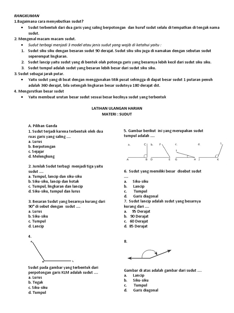 · melakukan penyelidikan tentang berbagai besar sudut dengan menggambar berbagai contoh bangun datar seperti ; Pengukuran sudut menentukan besar sudut 1 putaran, 1/2 putaran, dan 1/4 putaran dalam satuan derajat. Jumlah maksimal besaran sudut dalam bidang dan ruang adalah 360 derajat. Kewajiban dan hakku di sekolah kelas : Demikianlah akhir dari materi dan soal bahasa inggris kelas 3 sd.