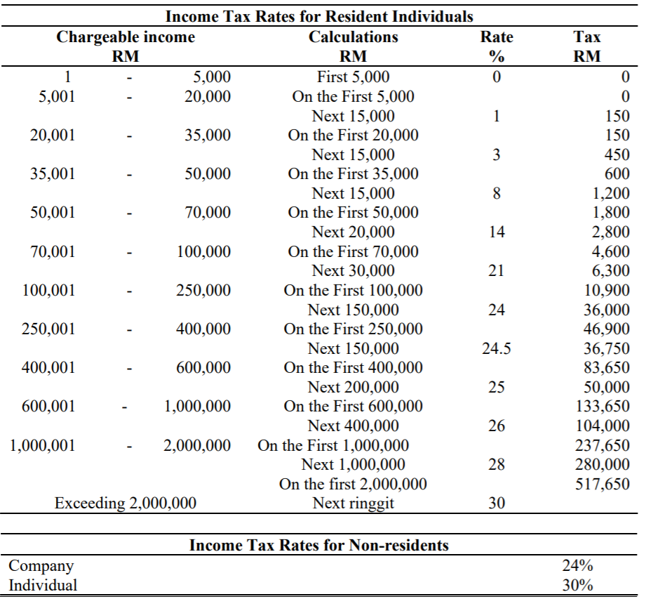 Malaysia's progressive personal income tax system involves the tax rate increasing as an individual's income increases, starting at 0% for up to rm5,000 earned, to a maximum of 28% for annual income of over rm1 million.