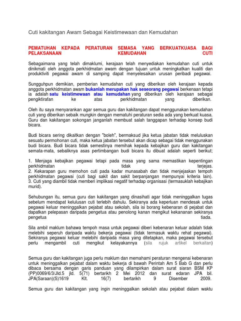 Cuti Rehat Penjawat Awam / Pemohon telah diberitahu dan cuti telah direkod.. 14/2008 dan dilantik ke jawatan lain yang kadar kelayakan cuti rehatnya adalah lebih Melalui pekeliling yang dikeluarkan pada 2008, kerajaan memutuskan gantian cuti rehat (gcr) yang boleh dikumpulkan oleh penjawat awam kekal 150 hari dan dibayar dengan wang tunai. Jpa(s)223/8/3 klt.7(47) bertarikh 30 ogos 2005 Kadar cuti rehat tahunan dan tawaran opsyen kepada pegawai perkhidmatan awam tujuan 1. Semua pegawai kakitangan disarankan membuat perancangan awal untuk bercuti rehat.